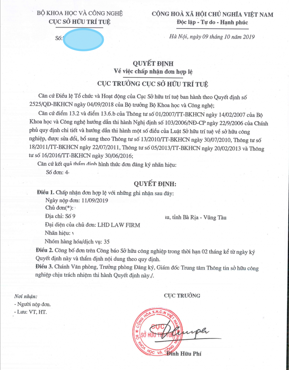 + In case the application is valid, the NOIP shall issue a decision to accept the valid application;
